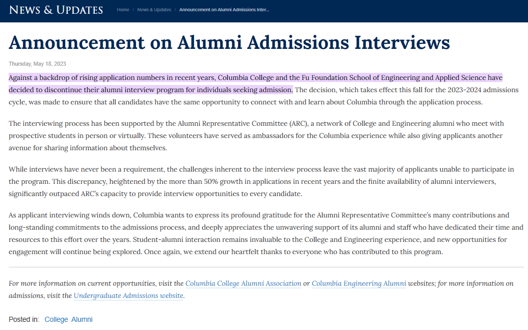 特别是随着近些年哥大申请人数的增长超过了50%,远远超出了校友面试的覆盖能力。出于公平性考虑,哥大最终决定取消校友面试。