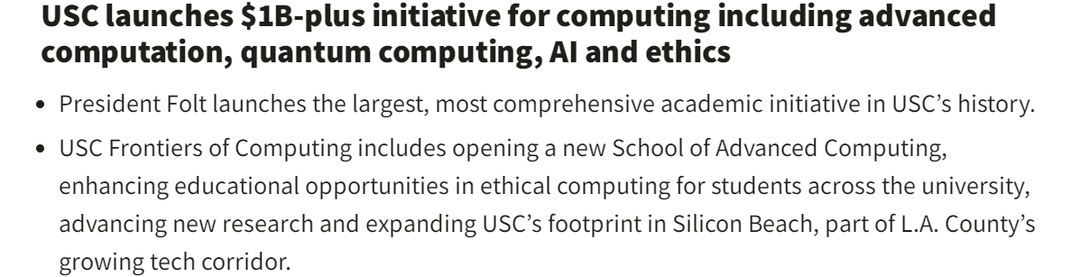 这项跨度长达10年、总投资超过10亿美元的“计算科学前沿计划”(Frontiers of Computing)是USC历史上规模最大、最全面的综合学科计划,将重点关注人工智能、机器学习、数据科学、区块链和量子信息等领域。