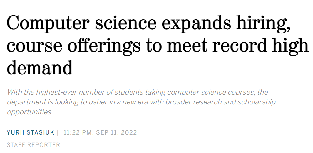 计算机科学是目前耶鲁大学第二受欢迎的专业。2022年秋季学期,计算机科学课程的总入学人数达到3,260人,创历史新高。