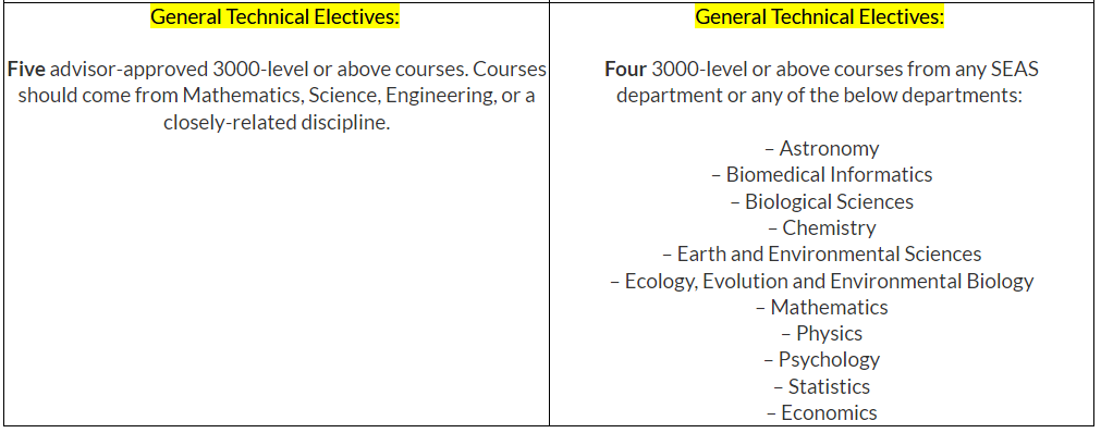其中,对于通用技术选修课程(General Technical Electives)的课程要求,哥大SEAS工学院也不再局限于与“数学、科学、工程或密切相关的学科”,而是放宽到各系的任何选修课!(包括:天文学、生物科学、地球与环境科学以及心理学等等。)