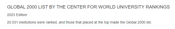 本周,世界大学排名中心(Center For World University Rankings,简称CWUR)发布了2023年世界大学排名。这份榜单列出了20531所高校和研究机构中的前2000名。