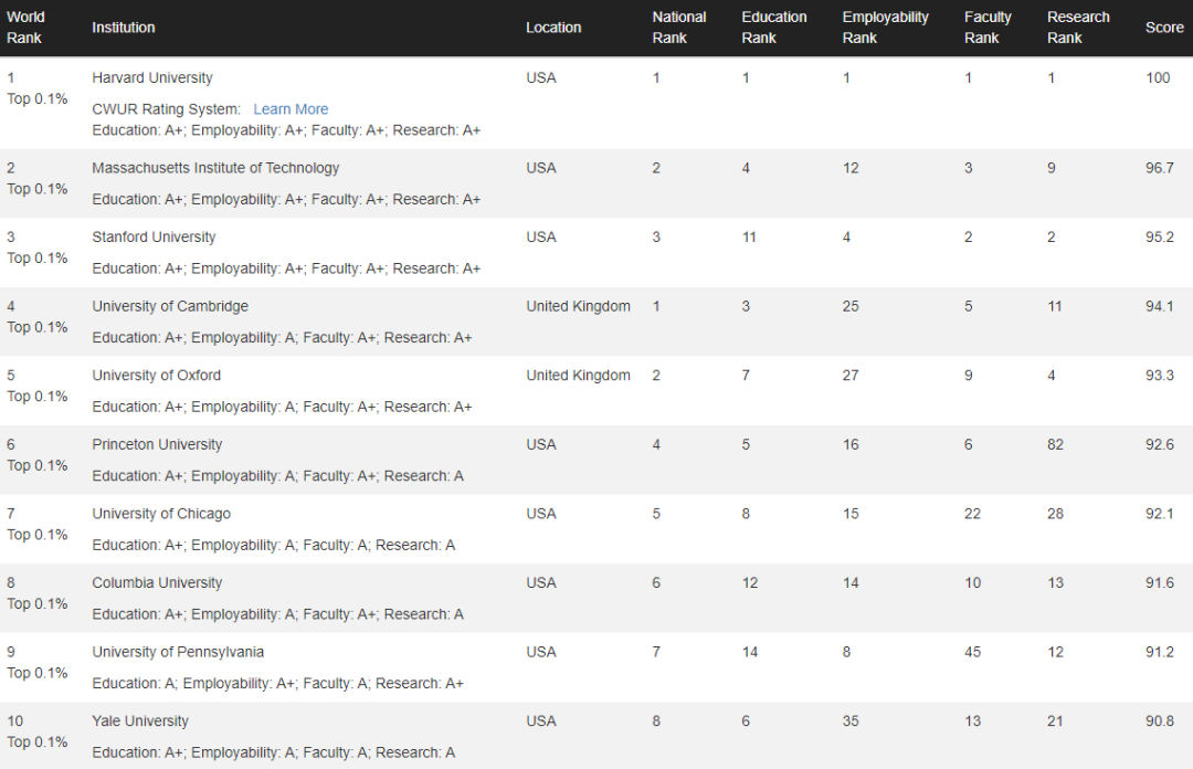 在此次排名中,哈佛大学连续第12年被世界大学排名中心(CWUR)评为全球顶尖大学。MIT紧随其后排名第二,斯坦福大学第三,剑桥牛津分别位居第四第五,和去年不同的是耶鲁又成功反超加州理工进入前十。(感觉每年的前十就只有加州理工和耶鲁在忽上忽下)