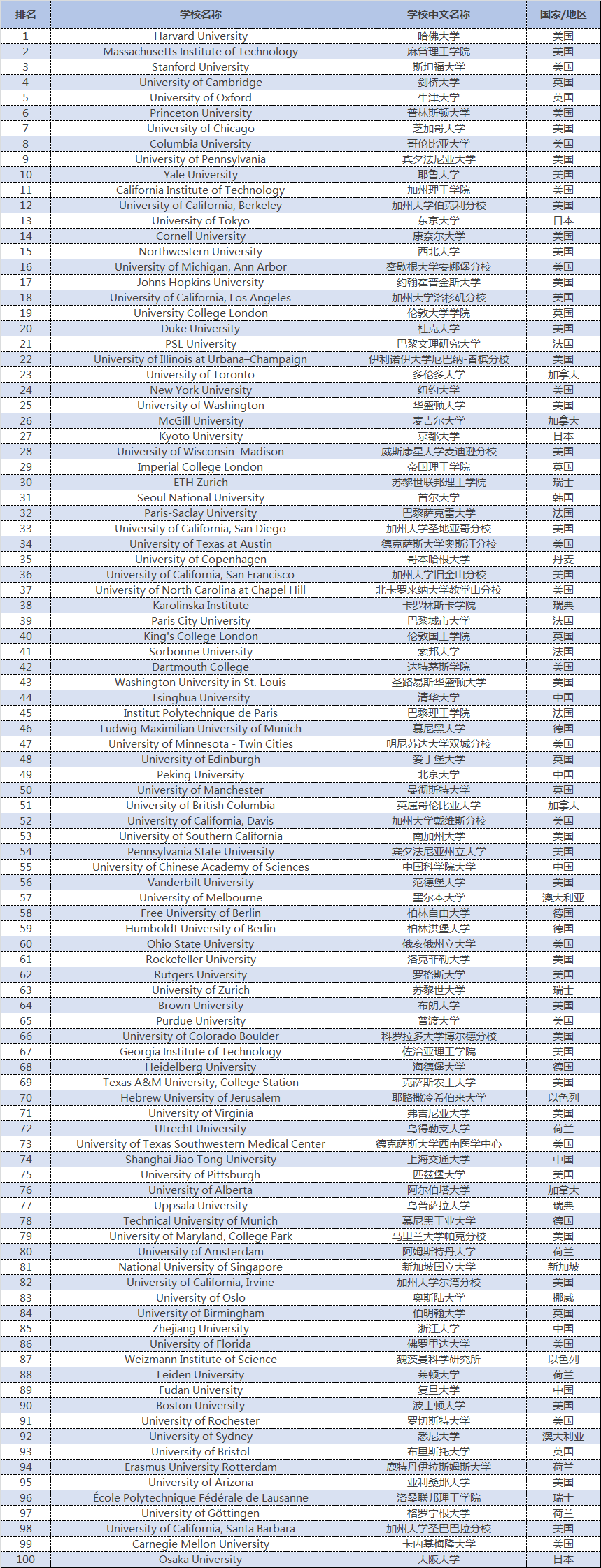 进入前100的英国院校有:剑桥大学(4)、牛津大学(5)、UCL(19)、帝国理工学院(29)、KCL(40)、爱丁堡大学(48)、曼彻斯特大学(50)、伯明翰大学(84)、布里斯托大学(93)。