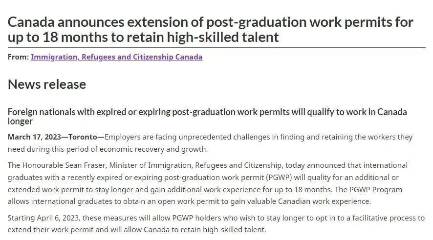 该政策将于2023年4月6日正式生效,从当天开始,符合毕业工签延期的申请人,将会收到移民局通知,确认是否延长工签并更新个人信息。